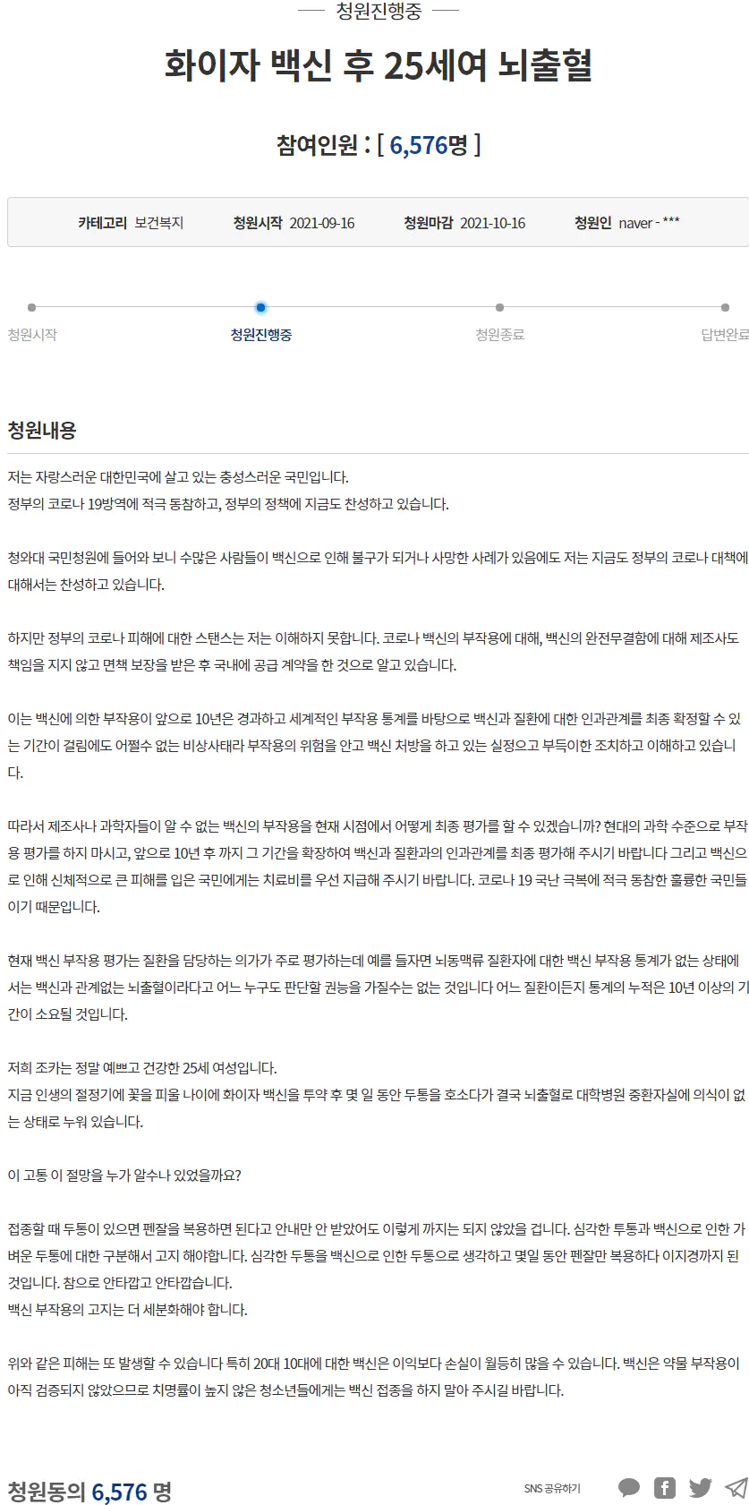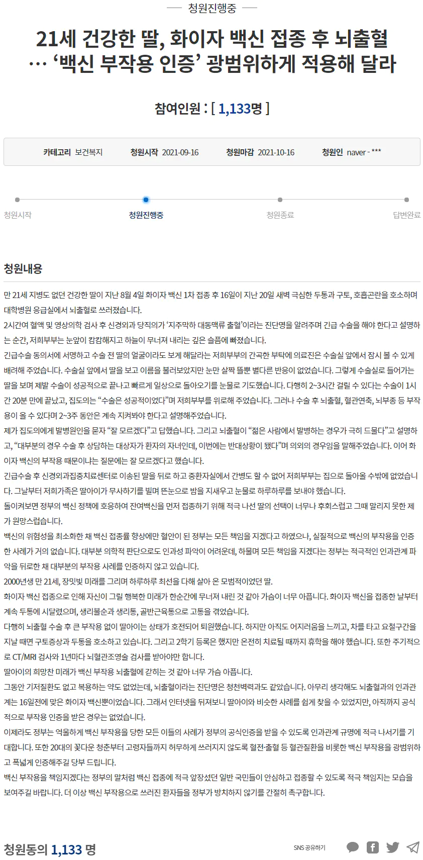 청와대 국민청원에 들어와 보니 수많은 사람들이 백신으로 인해 불구가 되거나 사망한 사례가 있음에도 저는 지금도 정부의 코로나 대책에 대해서는 찬성하고 있습니다.