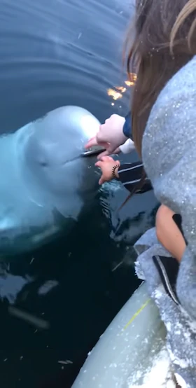 물에 빠져 잠긴 휴대폰을 건져주는 돌고래