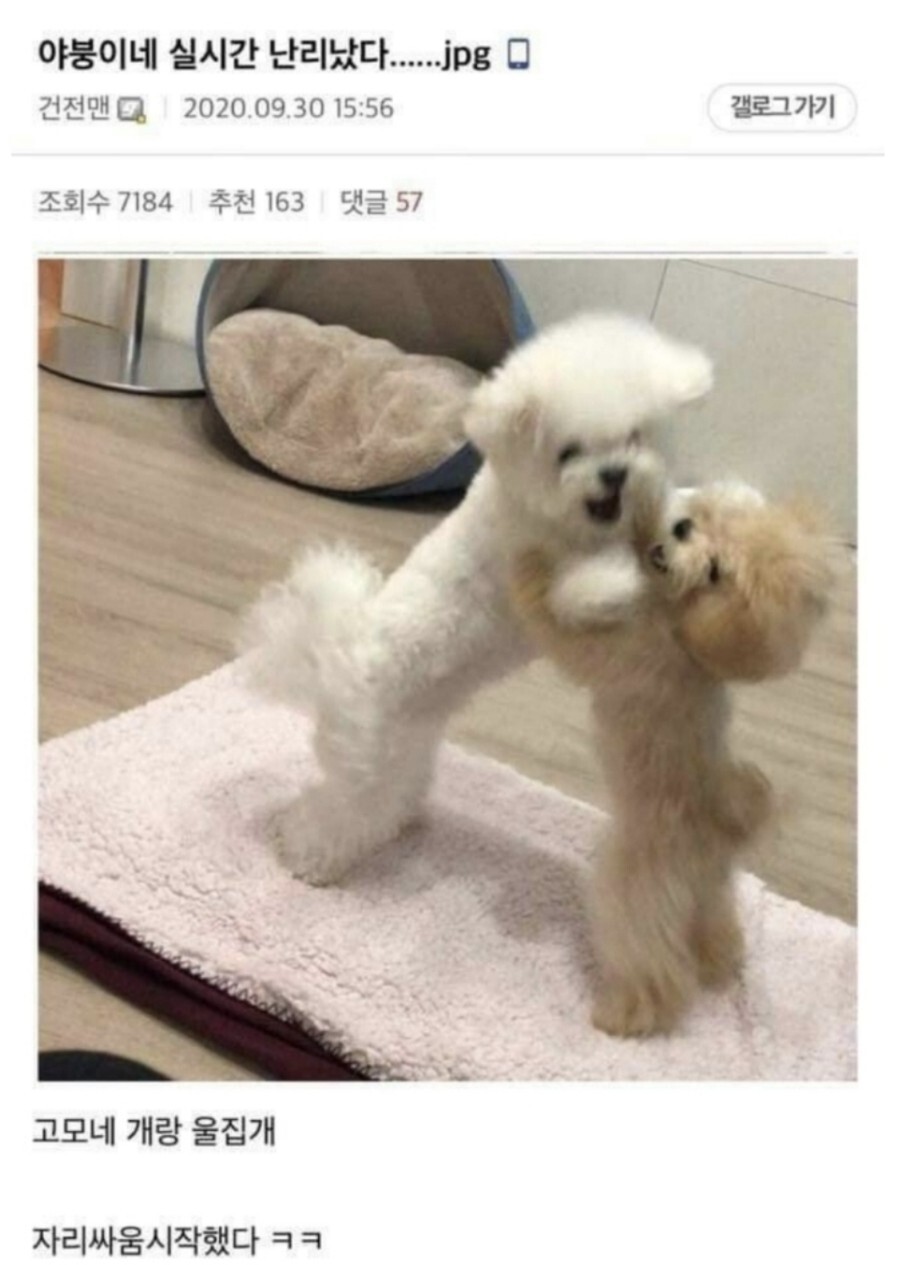 개 두마리 처음 봤을 땐 오랜만에 만나서 반가워하는 거라는 드립이었는데