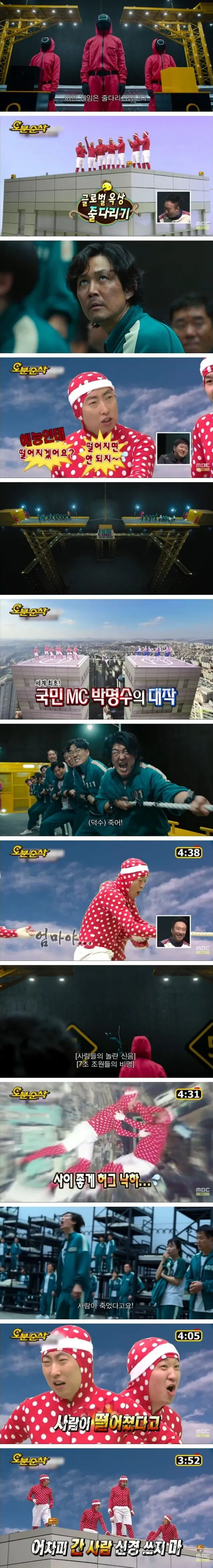 반쯤 농담성으로 커뮤니티에서는 3회전 줄다리기가 무한도전의 고공 줄다리기가 연상된다는 반응도 나왔다. 공교롭게도 무한도전에서도 오징어 게임의 "사람이 죽었다고요!"랑 비슷한 "사람이 떨어졌다고!"(2:24) 라는 대사가 있다.