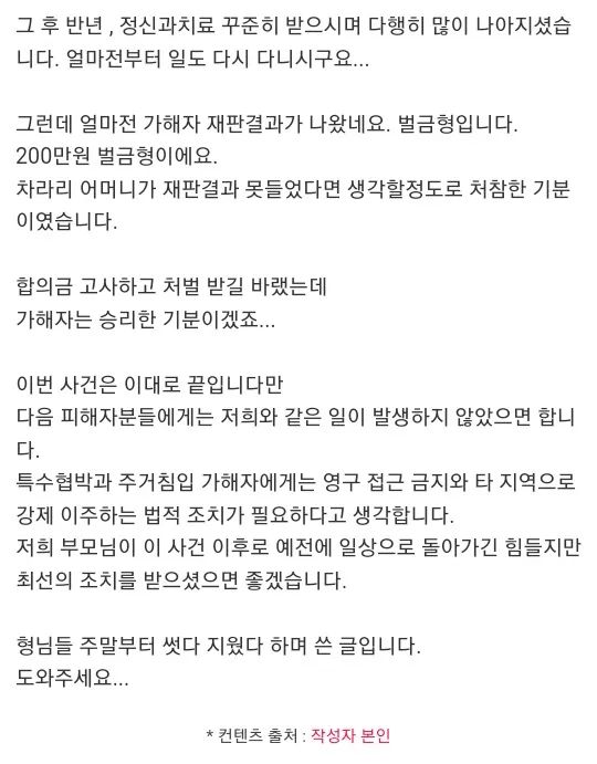 저희 부모님이 이 사건 이후로 예전에 일상으로 돌아가긴 힘들지만 최선의 조치를 받으셨으면 좋겠습니다.