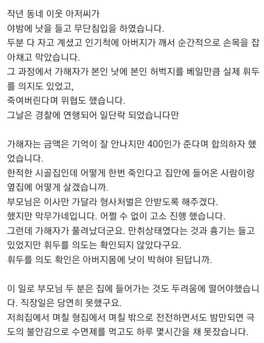한적한 시골집인데 어떻게 한번 죽인다고 집안에 들어온 사람이랑 옆집에 어떻게 살겠습니까.