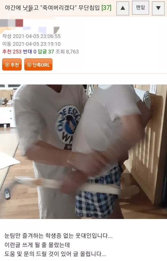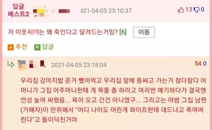 우리집 강아지밥 준거 뺐어먹고 우리집 앞에 똥싸고 가는거 참다참다 어머니가 그집 아주머니한테 개 목줄 좀 하라고 여러번 얘기하다가 결국엔 언성 높여 싸웠음... 욕이 오고 간건 아니였구... 그리고는 야밤 그집 남편(가해자)이 만취해서 "어디 나이도 어린게 와이프한태 대드냐고 죽여버린다"고 들이닥친거야