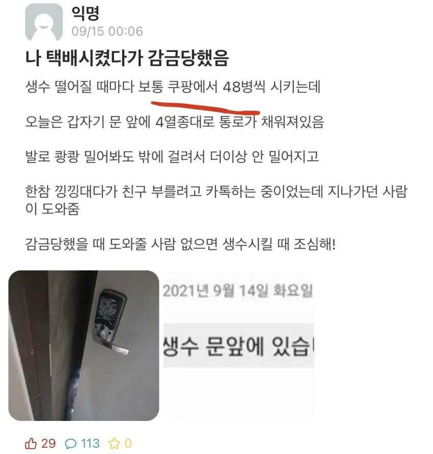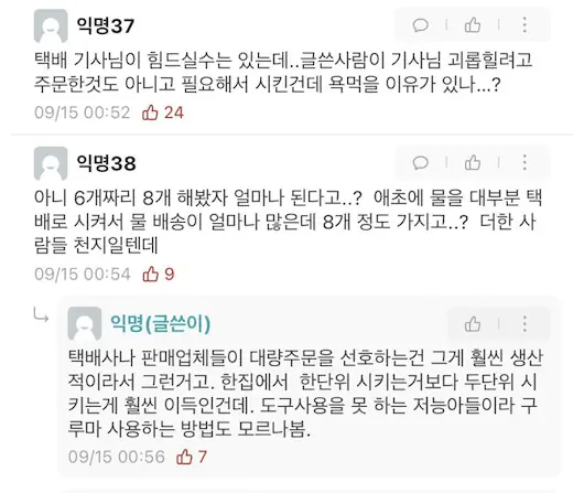 생수 한 번에 48개(거의 100KG) 시킨게 잘못이다 VS 문제없다로 나뉘어서 불타는중