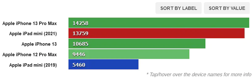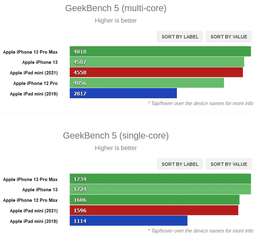 그 결과로 iPad Mini 는 세번째 버전의 CPU 를 사용한다는 것을 보여줍니다. iPad Mini(2021)에 CPU는 최대 2.93GHz로 실행되었으며 4GB RAM 입니다. 그리고 아이폰 13과 13 프로의 CPU는 최대클럭 3.23GHz로 구동되며, 각각 4GB와 6GB의 램을 가지고 있습니다.