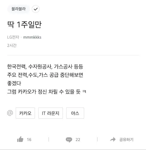 전기 한시간만 카카오 본사 끊어도 난리나는데 무슨ㅋㅋㅋㅋ