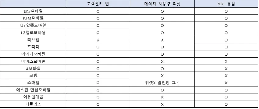 통신사별 고객센터앱, 데이터사용량위젯, NFC유무 정보. 이 외에도 MVNO 통신사 많음