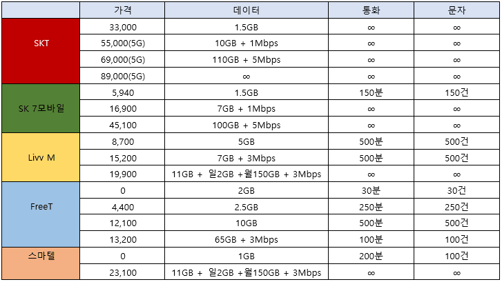 물론 저 중에는 기간한정 할인인 경우가 많긴 하지만 그거 끝나도 메이저3사랑은 비교할 수 없이 저렴하다.