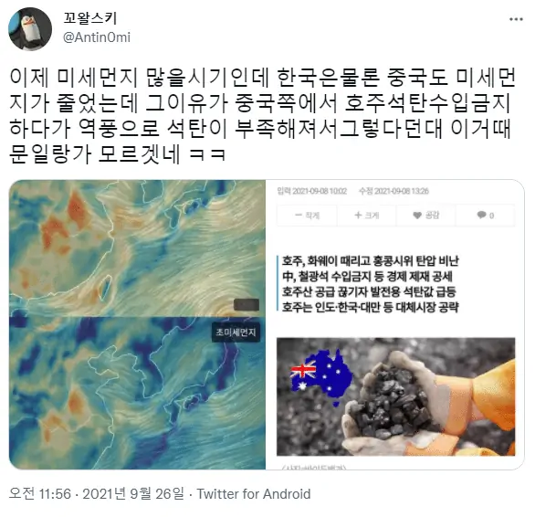 호주한테 개쳐맞는중이지 ㅋㅋ 호주가 석탄 철강안파니까 전력난에 공장안돌아감 ㅋㅋ 중국따위가 주제를 알아야지