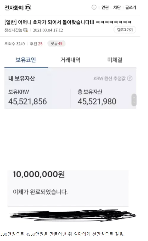 참고로 쟤가 엄마한테 1000만원을 준 이유는 가족에게 용돈을 줄때 증여세금 면제액이 최대 1000만원이기 때문이다. 즉 평소에도 저런걸 자주 해 본 돈 많은 부자 가족들끼리 돈 와리가리치면서 장난좀 치는거 뿐이다. 너네들은 따라하지 마라.