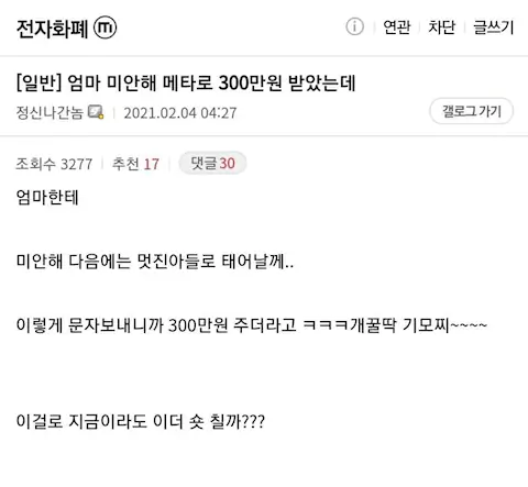 "엄마 300 이 아니라 3000을 줬어봐... 그럼 내가 1억을 줬을텐데... 엄마 참 생각 없다 그치??????"