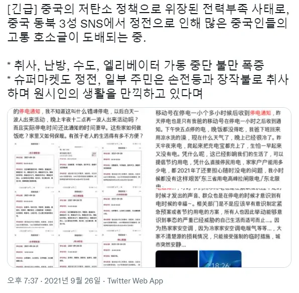 47. 블랙아웃 걱정까지 생긴 중국정부는 전기를 많이 쓰는 알루미늄 제련소의 가동을 중단했고, 전력난이 심각한 저장, 광둥, 장쑤성의 공장들을 멈춰 세움. 상당수 기업에게 10월7일까지 조업중단 통보가 날라듬
