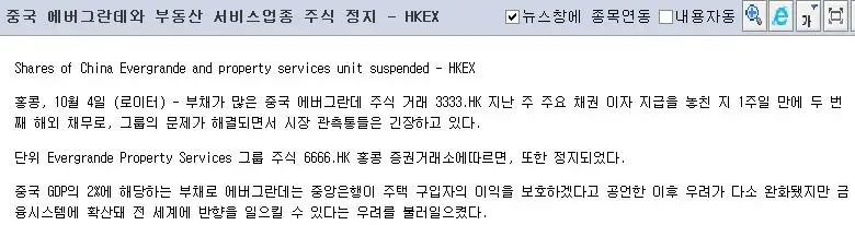 에버그란데 전 계열 주식은 홍콩증시에 상장되어 있음, 이게 싹 다 거래정지 먹었다는 얘기, 외채 상환이 안되면서 에버그란데 전체 계열이 부도 날 가능성 99.99%, 에버그란데 외채 부도나면 관련 기업 영향 안 갈수가 없음, 홍콩증시 멸망각잡히는데 문제는 짱개 공산당 운영방식이 공산당 사업별로 서로 다 얽혀있는 상황, 이래서 짱개 연쇄부도 얘기가 나오는거임