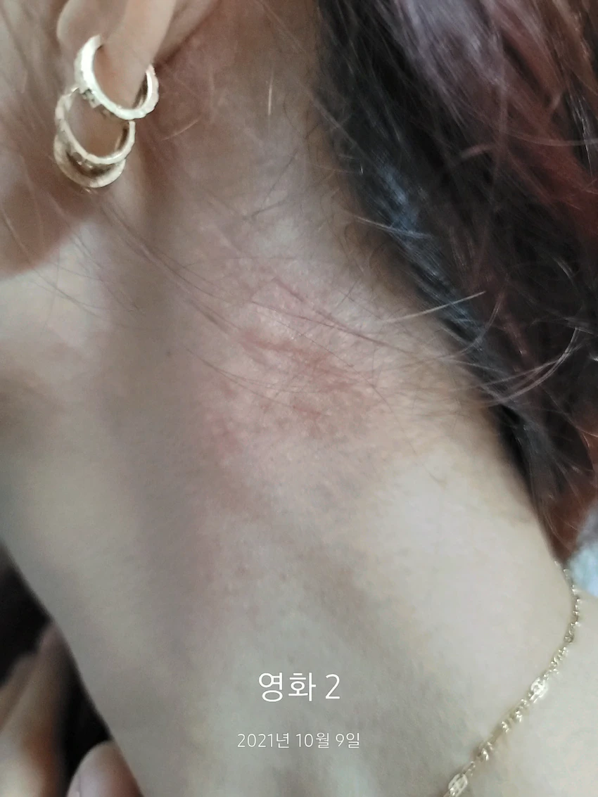 그런데 일주일 되던 날 목 양옆 두드러기와 오른쪽 뒷머리에 500원 동전 2개 크기만 하게 원형탈모가 생겼습니다.