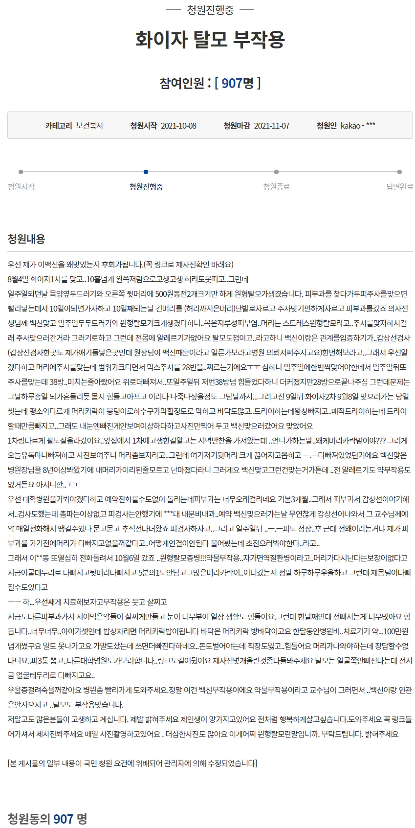 백신접종 부작용(탈모)환자의 피해 지원 및 부작용 인과관계에 대한 대책이 필요 합니다. 안녕하세요. AZ 1,2차 백신접종을 완료한 50대 주부 입니다. 만성 신장질환(장애5급) 및 신장이식환자 이