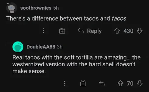 ㄴ "ㄹㅇ 진짜 타코는 부드러운 또띠야 써서 하는데 ㅈ도 모르는 양놈들 버전의 딱딱한 또띠야는 말이안됨"