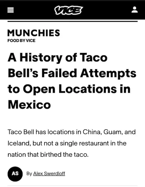 이유인 즉슨 1992년에 이미 미국을 점령한 타코벨이 멕시코의 대형마트에서 새로 시작하려 했으나 멕시코인들의 미적지근한 반응에 잘 안풀리고 진출 2년만에 멕시코에서 사업을 철수하게됨.