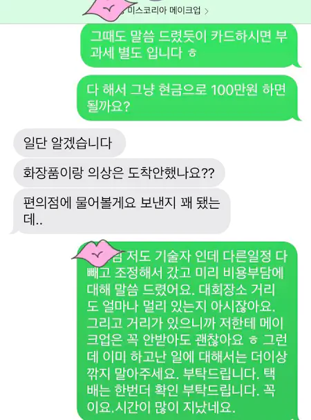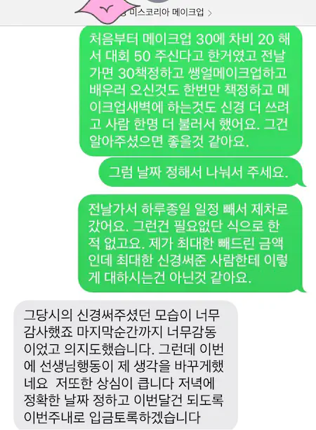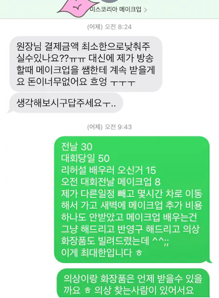 2. 8/24 일정을 확인하는 문자를 받았고, 저는 출장비용이 많이 추가된다고 고지했고 (비행기 티켓 값을 포함해 장거리로 이동하는 시간에 대비한 출장비) 전화 통화로 대회 본선 메이크업 1회 50만원 이상이 들것 이라고 얘기했습니다. 대회때 한명만을 위해 메이크업 하러가는 경우는 드뭅니다.