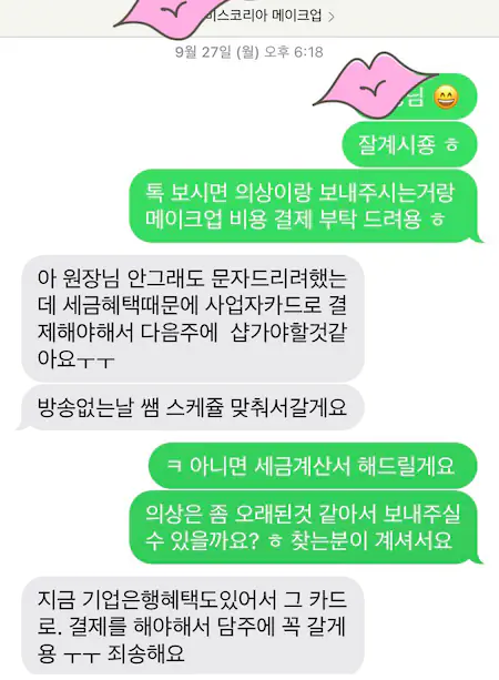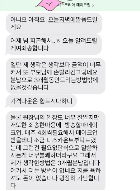 그리고 저와 아무런 상의도 하지 않은 상태로 ‘할인해주면 방송할 때 메이크업을 주4회 받으려고 했다’는.. 마치 아량을 베푸는 듯한 통보를 했습니다.