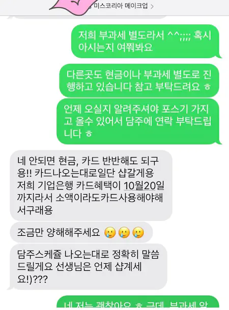 7. 9/27: 그 문자 후 14일 동안 아무 연락이 없어서 9/27에 제가 다시 문자를 보냈습니다. 그랬더니 갑자기 사업자 등록 카드로 결제를 하겠다고 해서, 카드 결제는 부과세가 포함된다고 안내했습니다. (처음부터 현금으로 말을 해서 할인을 해주었던 것)