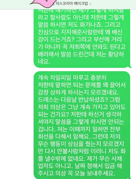 제가 문자를 보냈을 때 계속 바로 결제하고 의상도 반납을 하겠다며 말만 하다가 차일피일 결제와 반납을 미뤘습니다. 대회가 8월 31일이었는데, 벌써 오늘이 10월 8일입니다.