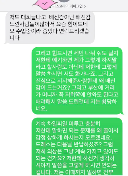 그리고 그 아나운서는 예선대회에 나갔다가 최종 6인 안에 들지 못했고, 멘탈이 나갔다며 기분이 나아지면 연락하겠다고 했습니다. 졸음을 미친 듯이 참으면서 집에 도착하니 11시가 되었습니다. 너무너무 고단하더군요. (돈을 하나도 못 받은 상태로 메이크업을 다 해드린 상황) 그래서 저는 일주일 정도면 기분이 괜찮아지실까 싶어 기다리다가 9/13에 연락을 했습니다. (결제도 안 되었고, 의상 4벌 반납도 안 된 상황)