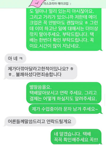 만나기로 한 약속시간은 한번도 지킨적이 없습니다. 그 이후로도 치아미백이나 피부 관리를 해야 한다며 갑자기 일정 변경이 잦았습니다. (저는 이 지역 큰 방송국들 메이크업을 맡아서 하고 웨딩 메이크업도 하기 때문에 매우 바쁘고, 프리랜서라 시간이 돈입니다. 예약을 받은 시간은 다른 일을 잡을 수 없기 때문에 당일 변경은 저에게 큰 피해를 끼치는 일인데도, 어차피 맡아서 해주기로 한 분이기 때문에 최대한 젠틀하게 대응했습니다.