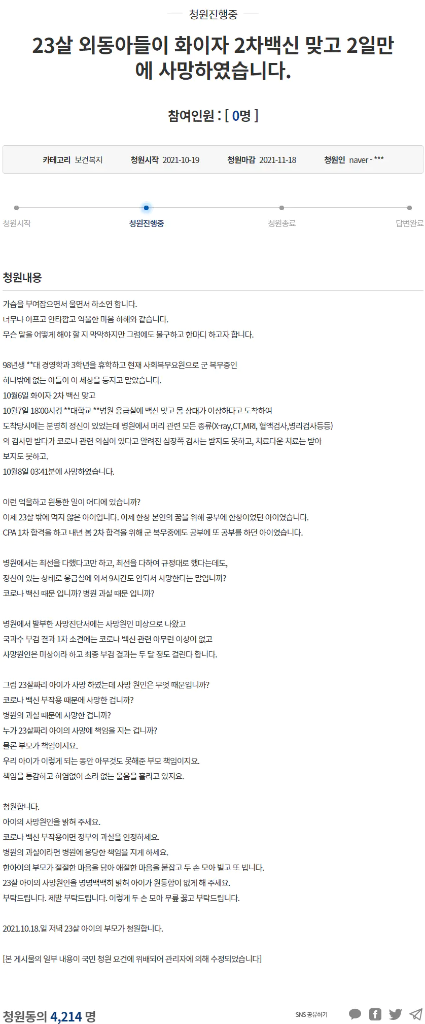 사회복무요원으로 복무하며 공인회계사(CPA) 2차 시험을 앞둔 한 대학생이 화이자 2차 접종 이틀 만에 숨졌다는 청원이 올라왔다. 국과수 부검 결과 1차 소견에는 백신과 관련이 없는 것으로 판단
