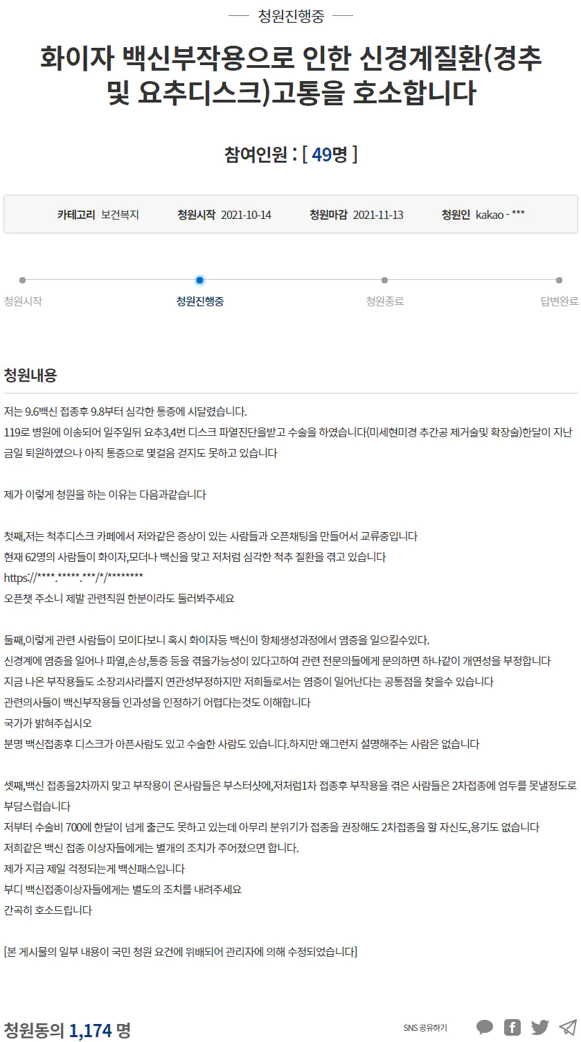 화이자 백신부작용으로 인한 신경계질환(경추 및 요추디스크)고통을 호소합니다