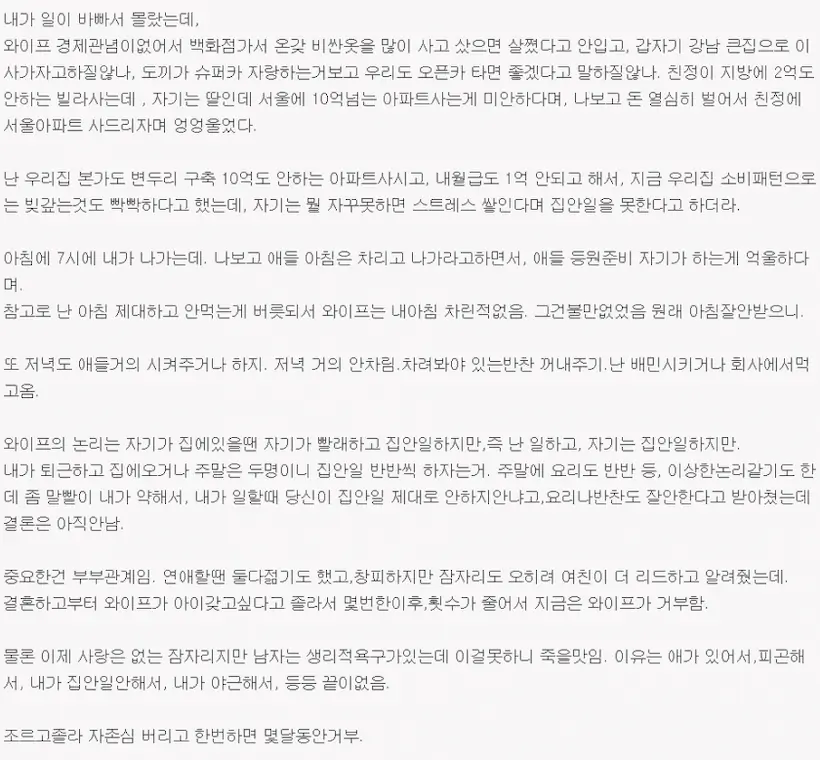 이미 십여년 전에도 저런 삶 사는 공대남들 많았지. 근무지 충청도인데 와이프가 죽어도 수도권에너 못 내려간다고 남편 편도 두시간 장거리 출퇴근 시키던 차장님 와이프... 용돈이 적어서 후배들 밥도 한끼 사주기 힘들어 하시던 차장님