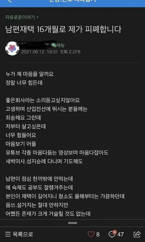 지난주쯤인가 야근하고집에왔는데 아내한테 쿠사리먹고 슬퍼하던 형 생각나네ㅠ 댓글들 다 글쓴이한테 그게뭐어때서 이랬는데 이번주였으면 반응 달랐을듯