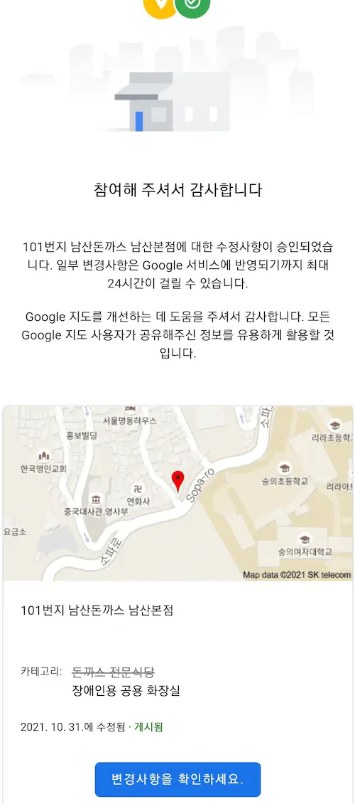 현재 Google 지도 사용자가 101번지 남산돈까스집에 대한 카테고리 수정 테러를 시도하여 돈까스 전문식당이 아닌 장애인용 공용 화장실로 되었다.