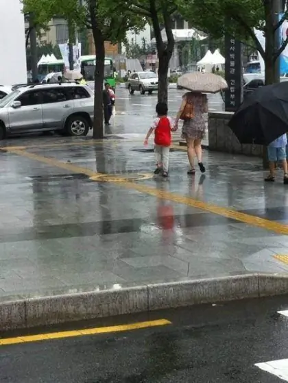 아빠는 애들에게 우산주고 자기는 비 맞으면서 걷는데 에휴....