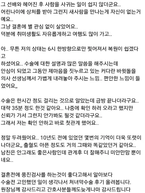 대충 이십대 중후반에 결혼전제로 만났는데 첫 관계에 처녀막이 찢어졌다? 존나 ㅆ못이 아니면 걍 처녀막 수술한거 99퍼다