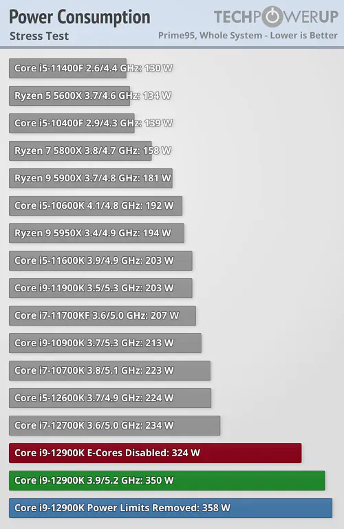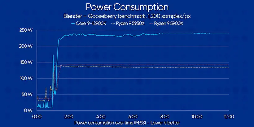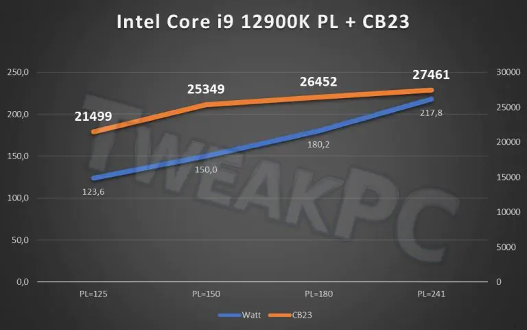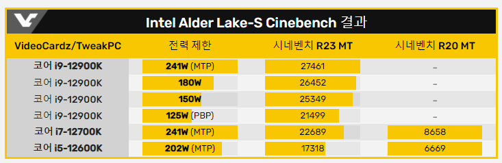 결과에 따르면 Core i9-12900K는 125W(PBP)에서 241W(MTP)로 증가하여 거의 28%의 성능을 얻었습니다.