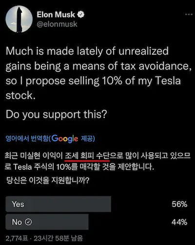 트위터에 테슬라 매도한다고 글올림 테슬라 안샀으면 친절하게 Yes 눌러주자 ㅋㅋㅋㅋ 테슬라 토큰시장에서 이미 4.5퍼 떡락중ㅋㅋㅋㅋ 일론머스크 테슬라 주식 10퍼 매도 선언 진심이라함 ㄷㄷ