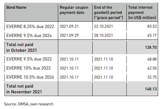 DMSA는 회사를 채권자로 파산 신청을 하기 위해 오늘(2021년 11월 10일) 유예 기간이 만료된 Evergrande 채권에 직접 투자했습니다. 전체적으로 Evergrande는 오늘까지 3개의 채권에 대해 1억 4,813만 달러의 이자를 지불해야 했습니다.