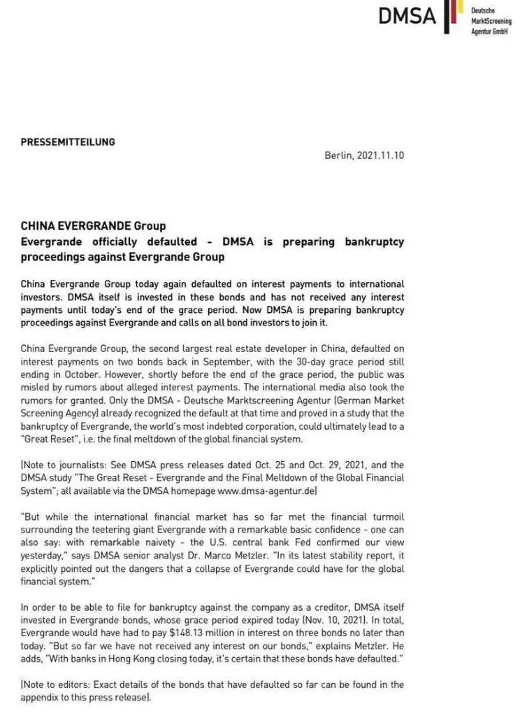 독일 시장 심사 기관인 DMSA 자체가 이 채권에 투자되었으며 오늘 유예 기간이 끝날 때까지 이자를 받지 못했습니다. 이제 DMSA는 Evergrande에 대한 파산 절차를 준비하고 있으며 모든 채권 투자자들이 이에 동참할 것을 촉구합니다.