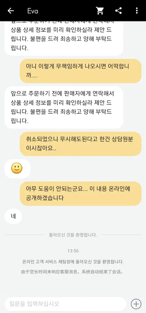 물론 읽씹을 당했고, 그 상황을 스크린샷으로 저장해서 고객센터에 메일로 보내놓은 상황입니다.