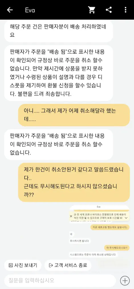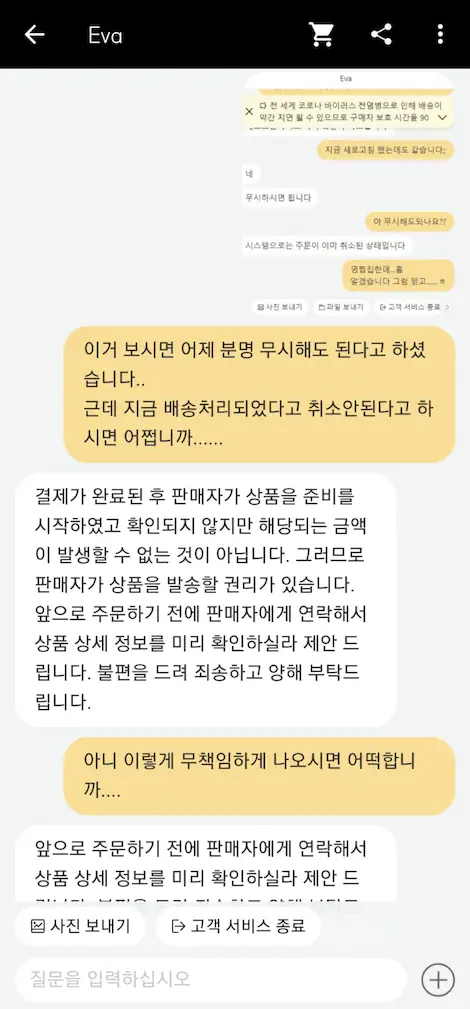 처음엔 알리에서도 제 편을 들어주다가 막판에 판매자 편 들더니 강제 종료되었네요 ㅋㅋ..