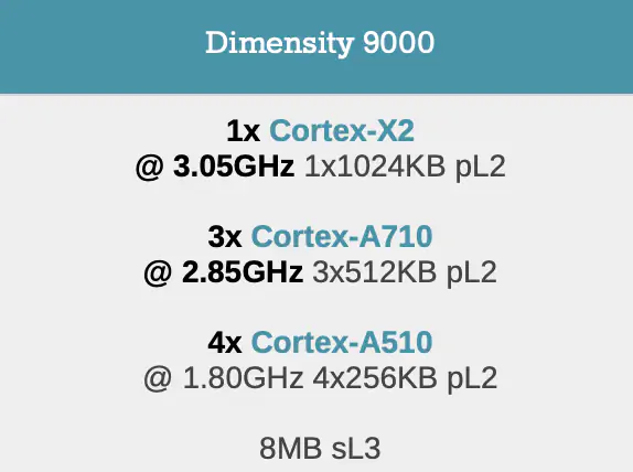 코어 구성입니다. 세계최초로 Cortex-X1의 후속작인 ARMv9기반 X2가 들어갑니다.