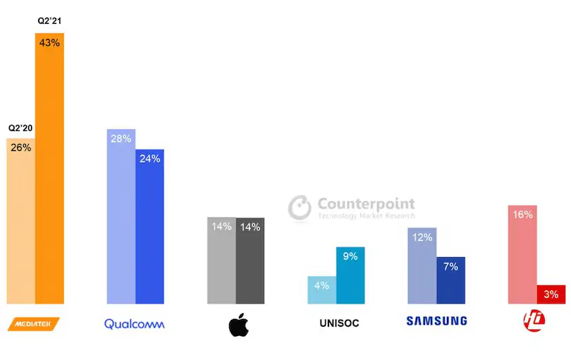 미디어텍은 2021년 큰 성장세를 기록하여 시장 점유율 1위를 차지했습니다.