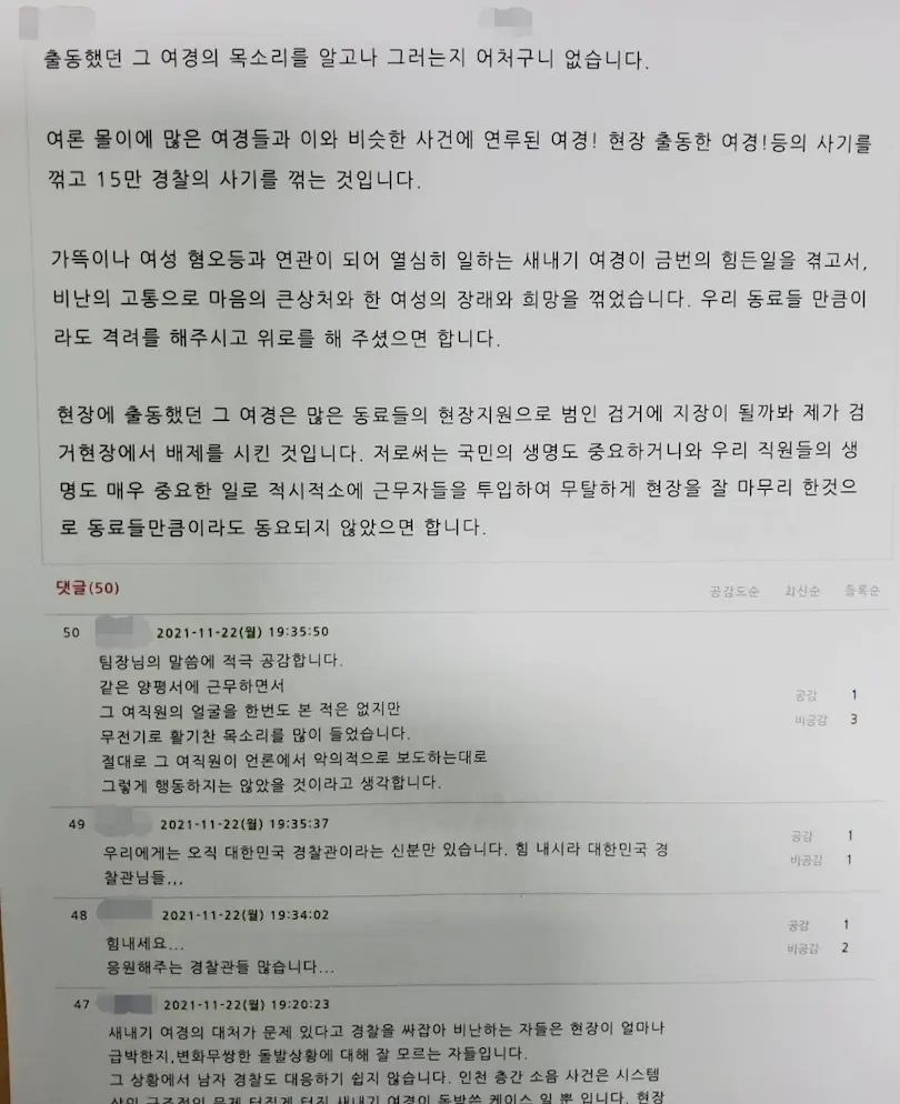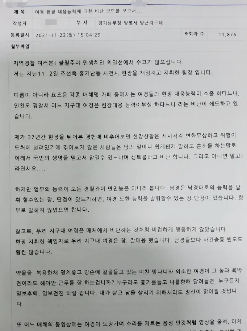 여경 보내지 마세요 ㅋㅋㅋㅋㅋㅋ 무려 이게 실화 ㅋㅋㅋㅋㅋㅋㅋㅋㅋ 단순 절도사건이나 물피도주 정도면 모를까 물리력 필요한 사건은 여경 출동시키면 추가로 순마 1대 더 보내야한다며?ㅋ