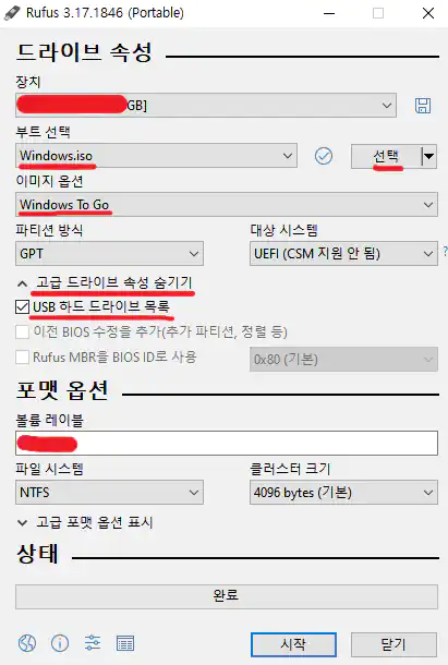 외장 ssd나 외장 hdd의 경우 고급 드라이브 속성 클릭 후 usb 하드 드라이브 목록을 체크한다