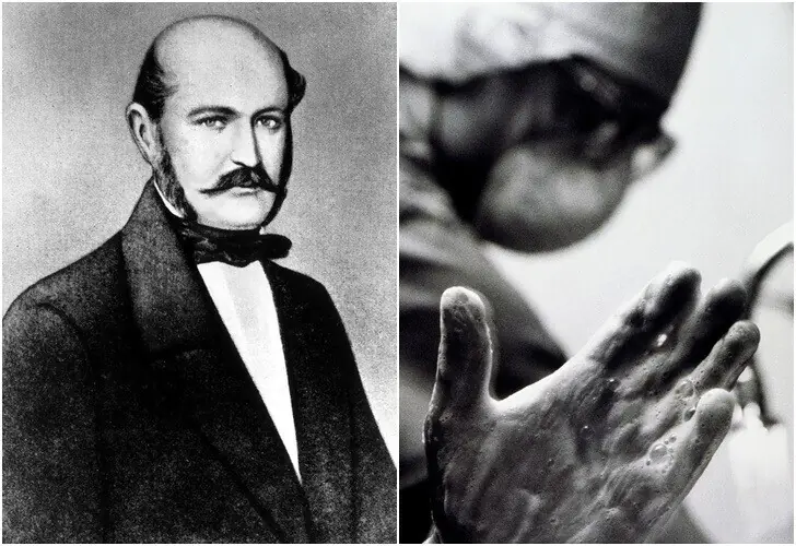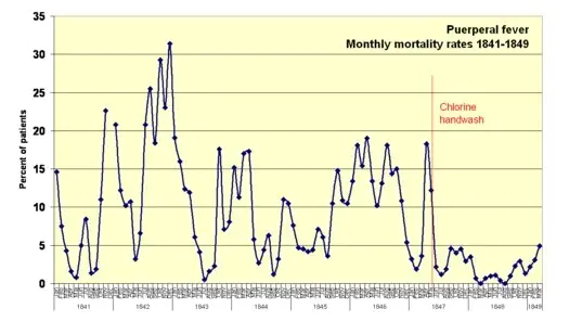 제멜바이스 교수는 시체 부검중 발생하는 '시체 입자'가 손에서 손으로 옮겨진다고 생각하고 염소액으로 손씻기를 시행했어.