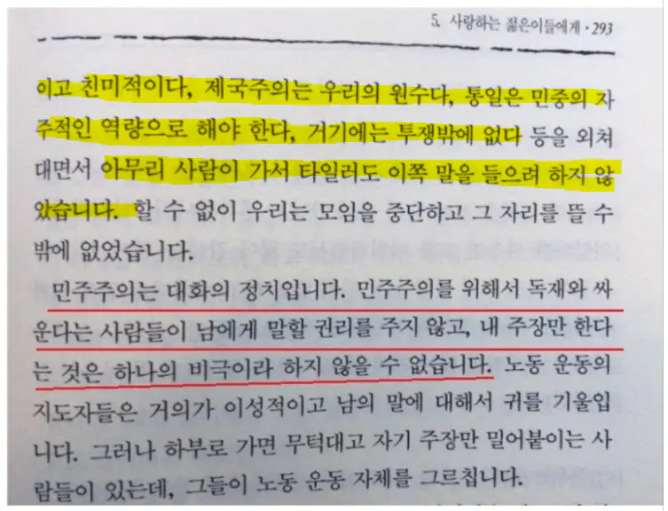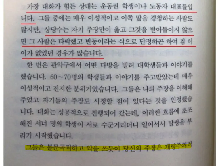 "운동권 학생들은 자기 주장만이 옳고 그것을 받아들이지 않는 사람은 타락했고, 반동이라는 식으로 단정하여 참 어이가 없었습니다"