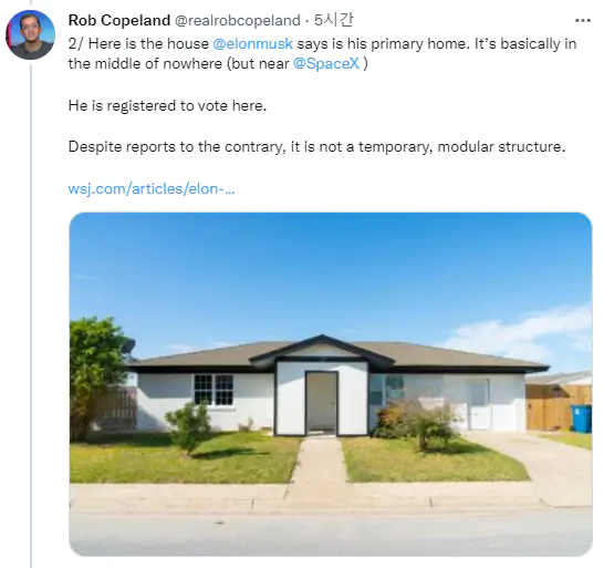 그는 올 6월 트윗 에서 SpaceX의 로켓 발사 시설 근처 멕시코 국경 근처 의 텍사스 마을을 언급하면서 "내 주요 집은 말 그대로 내가 SpaceX에서 임대한 Boca Chica/Starbase에 있는 ~50k 집입니다 ."그래도 좀 굉장해."