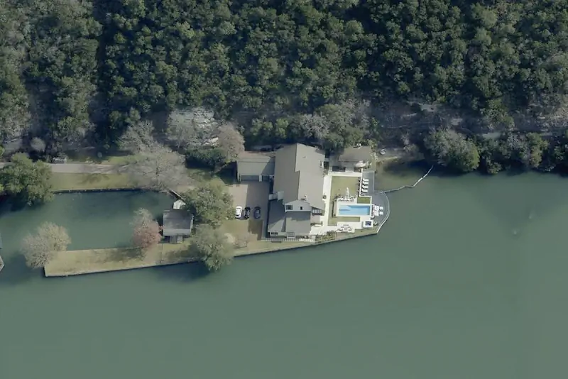부동산 기록에는 독점적인 오스틴 지역의 마운트 본넬 기슭에 있는 콜로라도 강으로 돌출된 반도의 거의 8,000평방피트의 내부 공간이 포함되어 있습니다. 워터 프론트 수영장, 자쿠지 및 전용 보트 슬립을 자랑하며 "Watersedge"라는 개발의 일환으로 여러 세트의 게이트와 경비실로 보호됩니다.