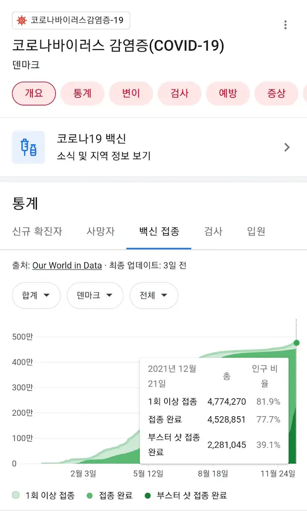 덴마크의 현재 백신 접종률은 12월21일 기준으로1회이상 접종 81.9%접종완료 77.7%부스터샷 접종 39.1% 입니다.