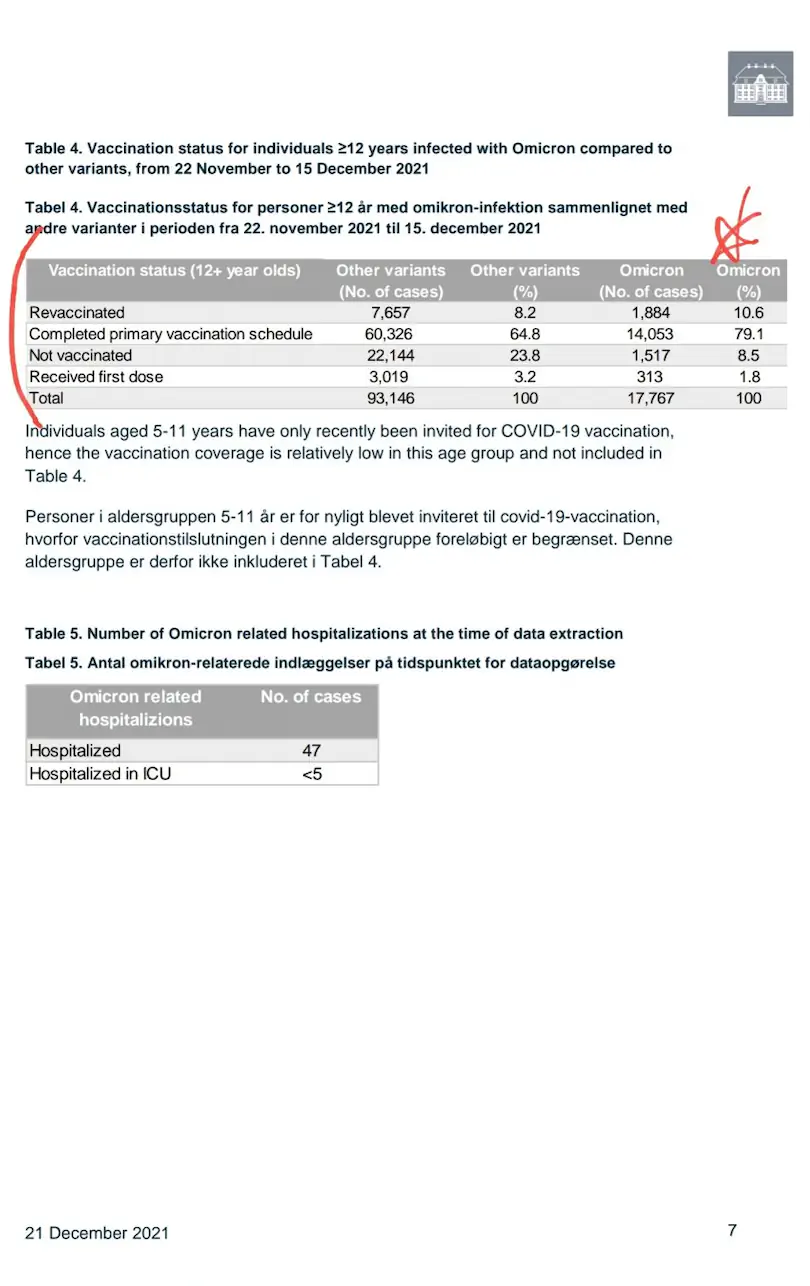 덴마크 '오미크론' 확진자 중 접종 / 미접종 비율 데이터 (출처 ssi)